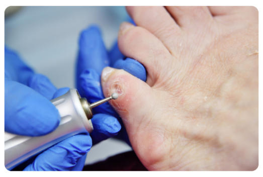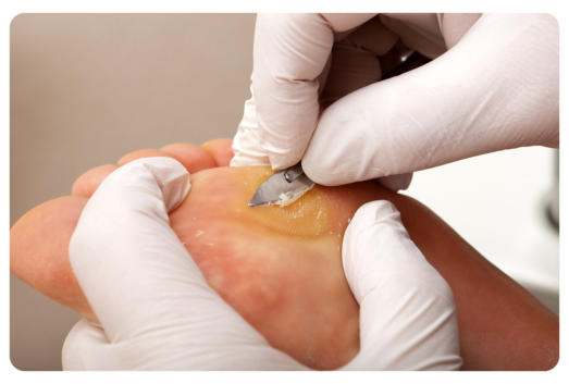 WarzenbehandlungBei Warzen handelt es sich um eine Virusinfektion, die in der podologischen Praxis nicht ursächlich behandelt werden kann. Allerdings können die Verhornungen abgetragen werden, die oft um und auf den Warzen entstehen und durch Druck ins Gewebe Schmerzen auslösen. Zusätzlich kann mit keratolytischen Mitteln die Warze lokal bekämpft werden.